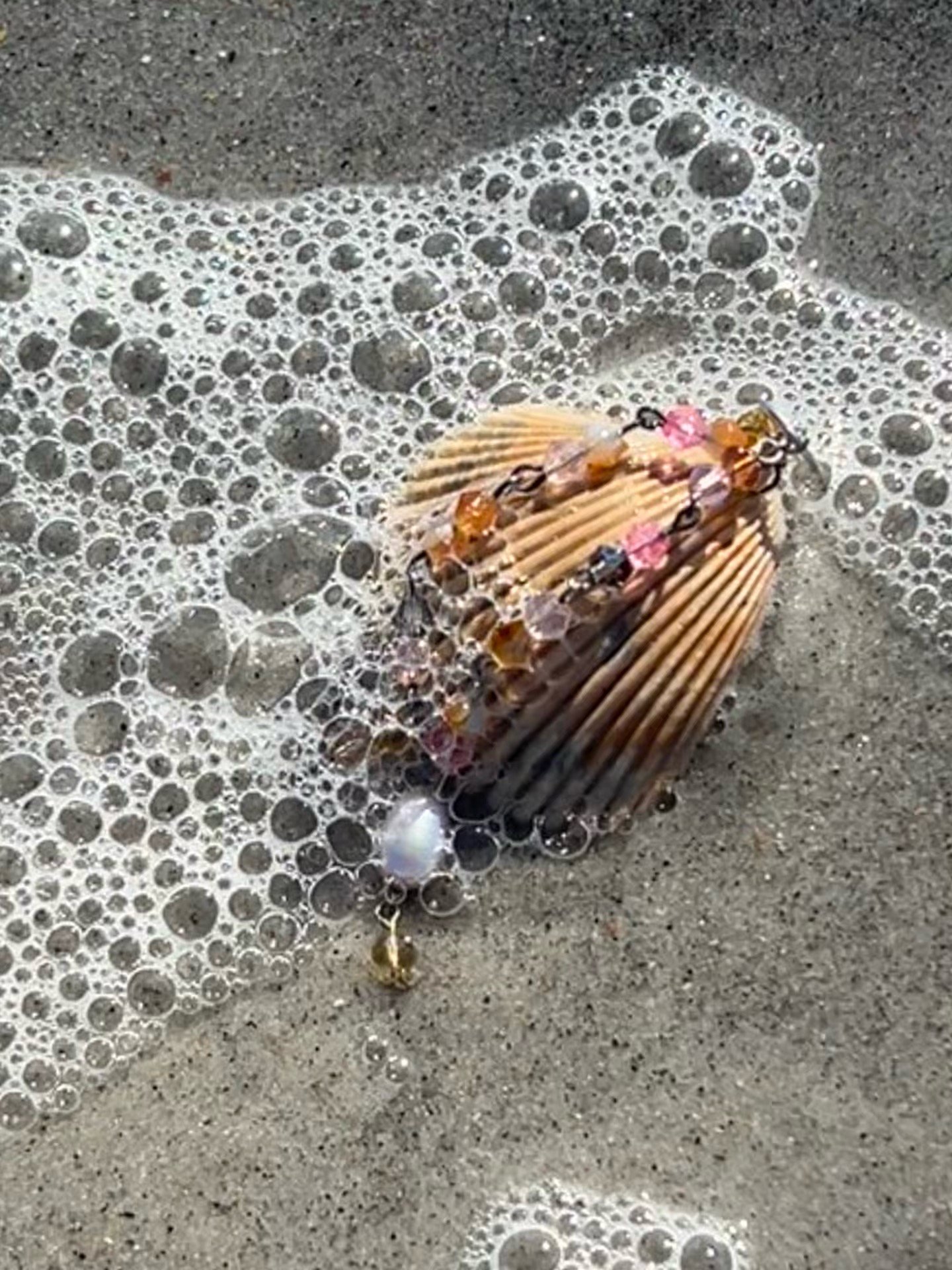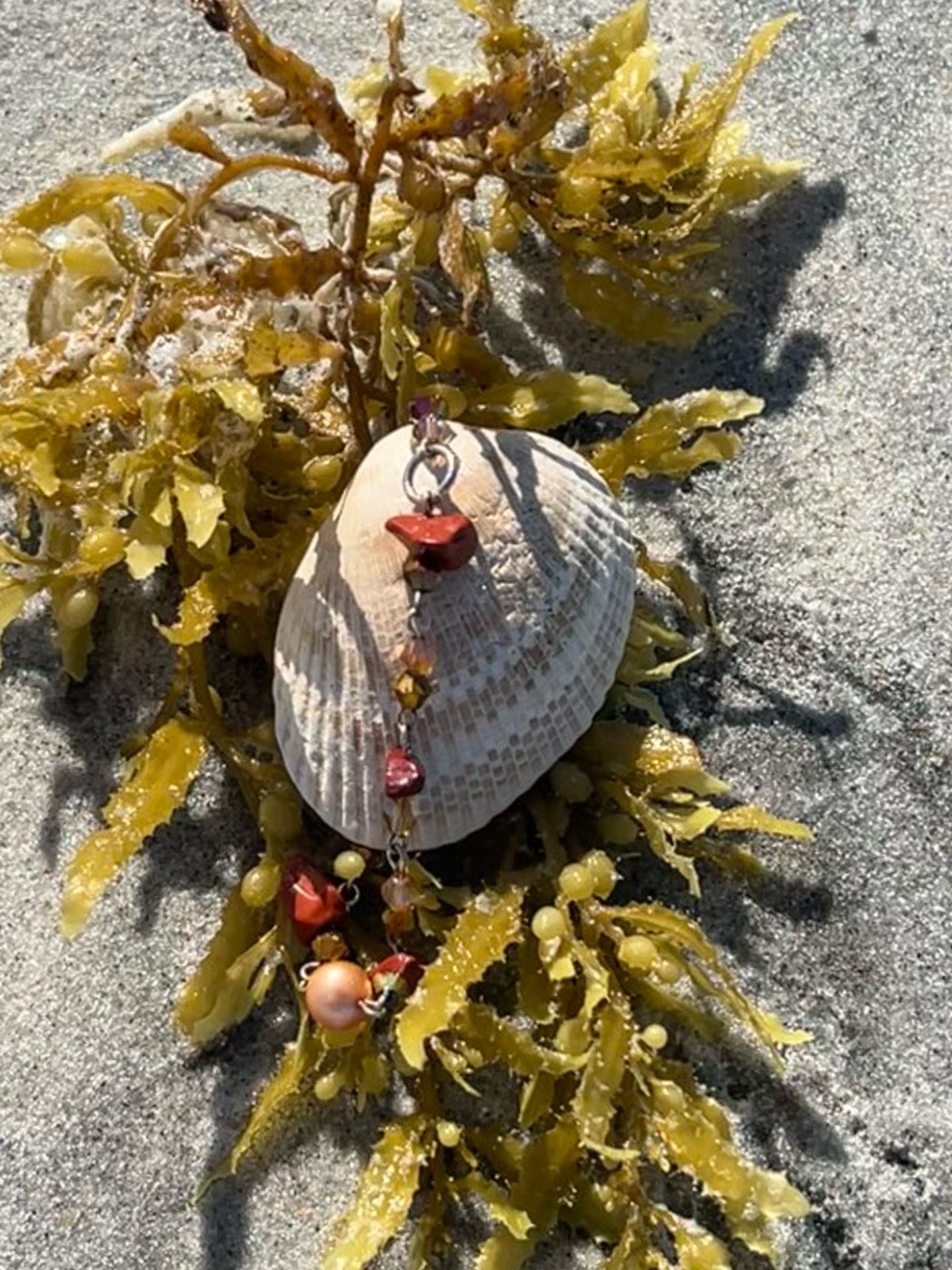 All materials are of the finest quality- Sterling silver and 14K gold filled, fire-polished cut glass crystal beads, salt and fresh water pearls, and a hand-picked shell from the beaches of St Augustine and other traveled locations. I pick the shells not for their perfection but for their story. Interesting shapes or colors appear with age and season- every shell truly different and truly unique with its own life story. I try to celebrate that individual story, looking at each piece singly. I don’t make masses of pieces; with me, it’s one then done, no matter how long it takes. I want to give respect to a life well and beautifully lived, and that comes with an open mind and heart, really listening to what the shell wants and how best to express its internal and intrinsic glory.